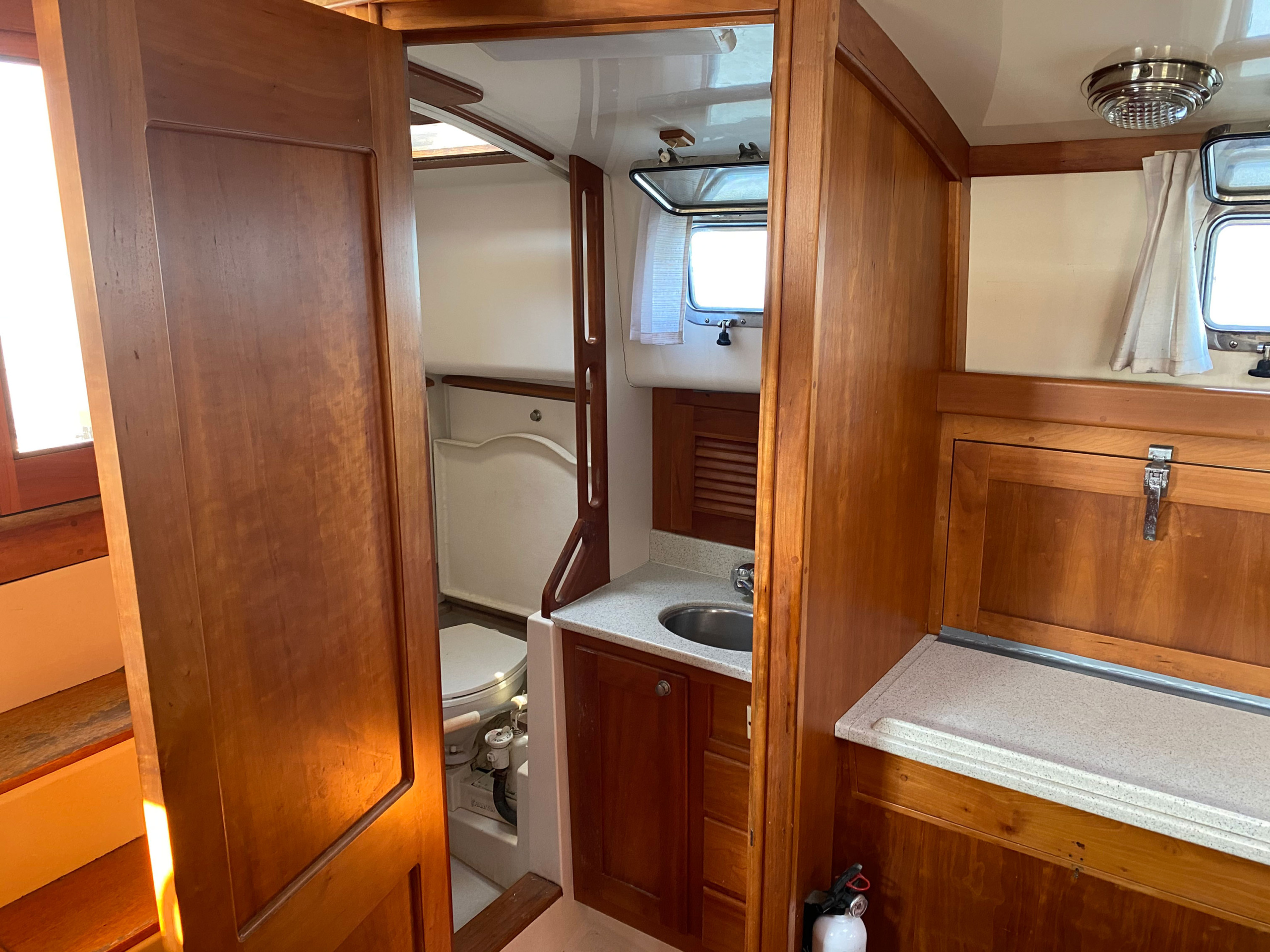 The galley features a large stainless steel sink with standard hot/cold faucet, a dedicated faucet with a Seagull water filter, and a handpump for either fresh or external water. The Avian counter tops offer plenty of workspace and the unique dish locker keeps dishes secure in any seas. Additional features include: