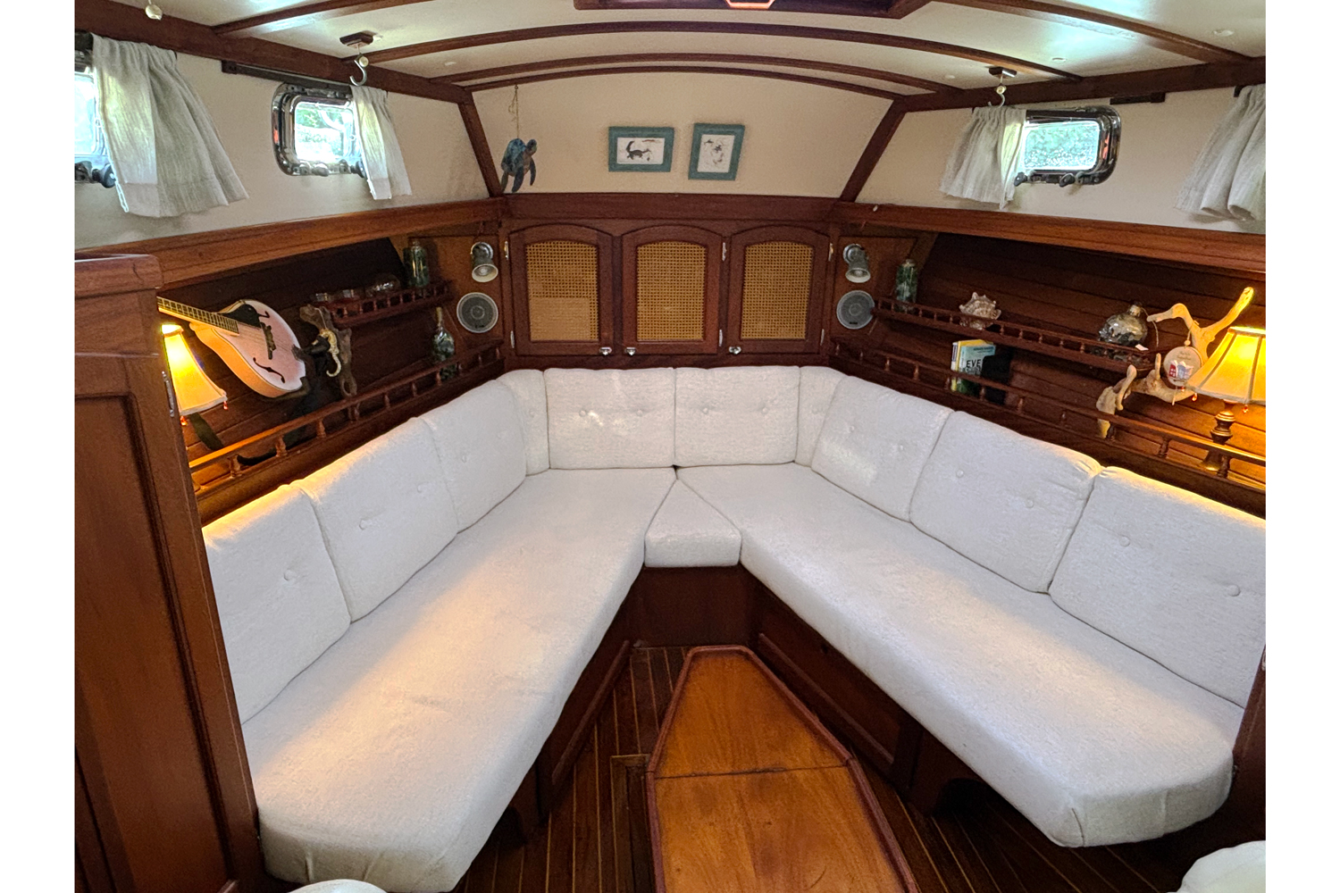 - The Interior is North American Cherry finished with satin varnish. The cabin sole is teak and holly sole and finished with high gloss urethane varnish. Cabin sole was refinished in 2025 with 8 coats of varnish. The cabin overhead is of gloss white fiberglass panels held in place by cherry battens.