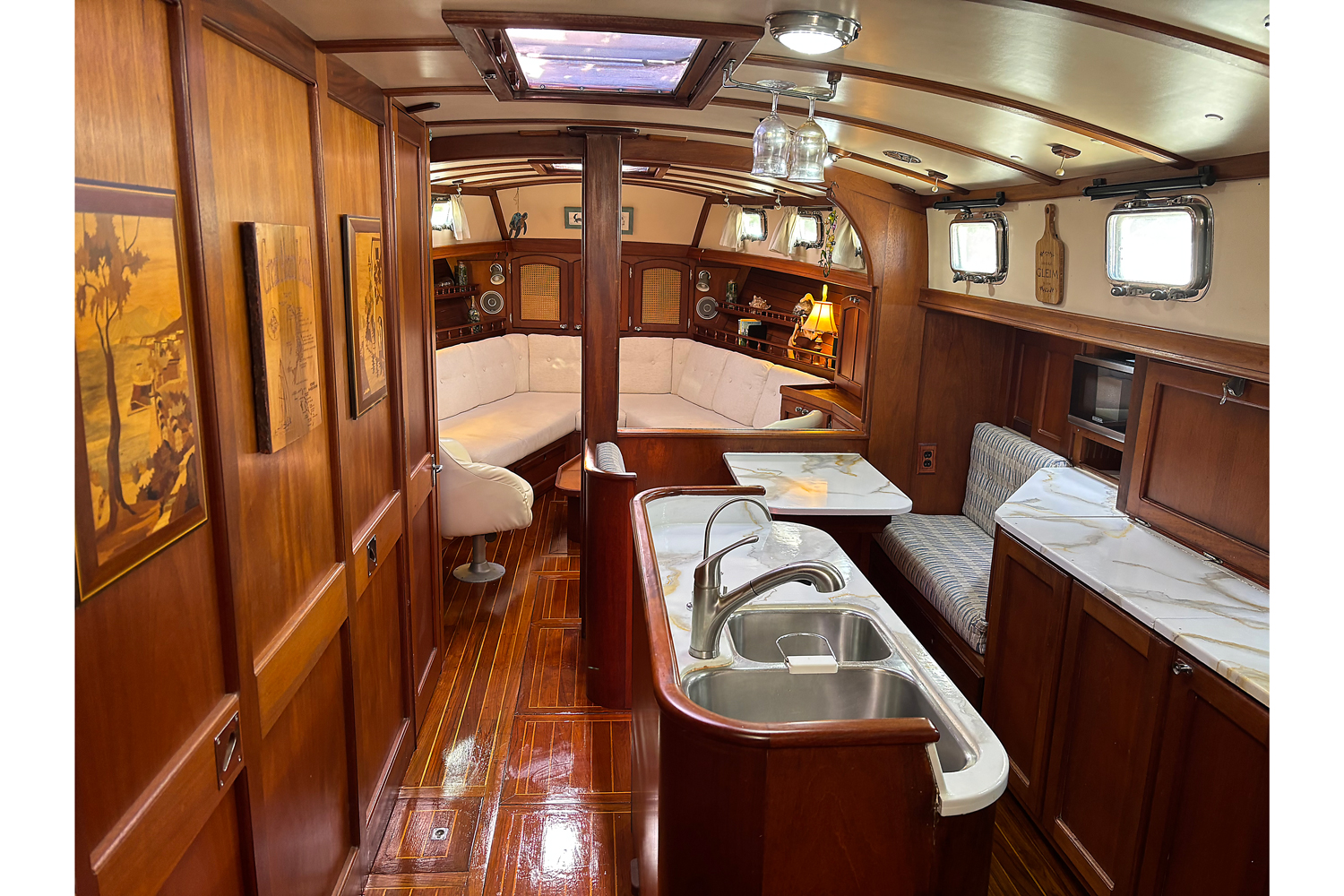 A two-person dinette sits just aft of the saloon opposite a well-designed amidships galley with a center island for secure bracing underway.