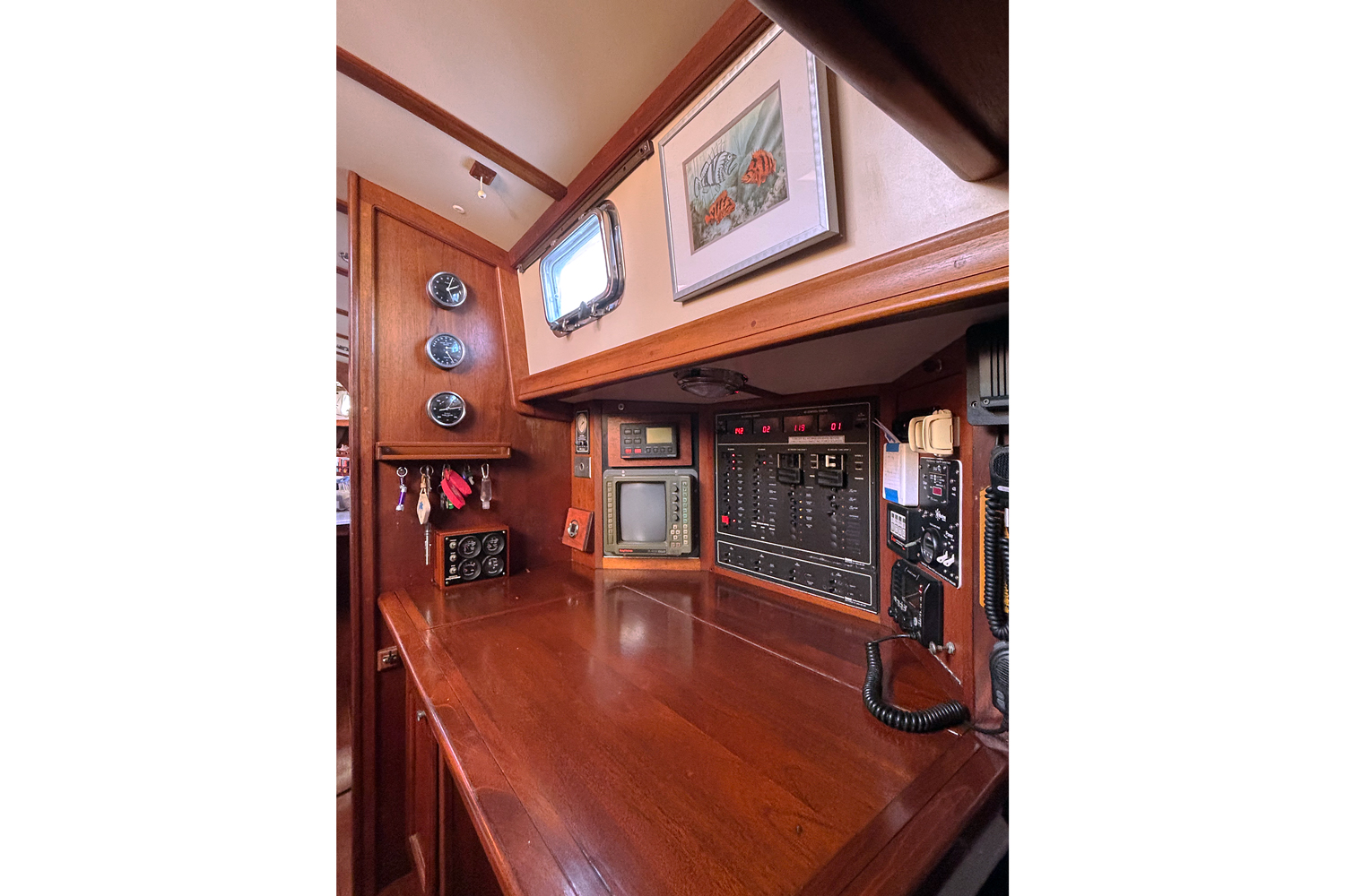 Aft of the galley is the navigation station with a large chart deck, seat, built-in electronics, electrical panels, and battery switches.