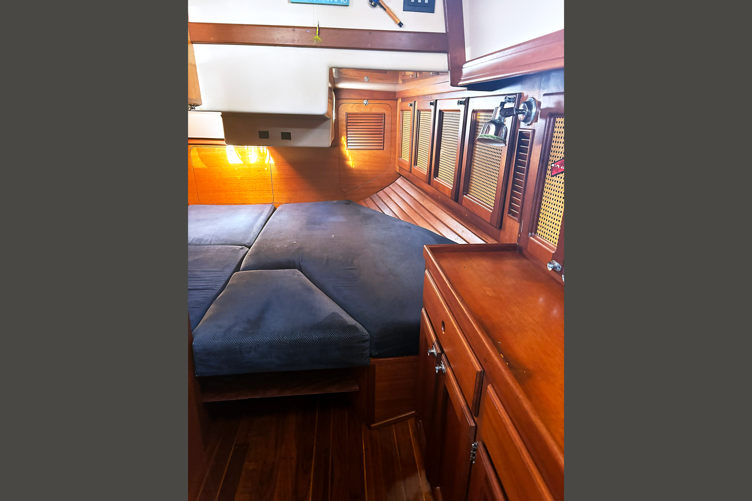 Opposite is a navigation station and a double quarter berth. The berth’s forward section serves as the nav seat with a removable backrest.