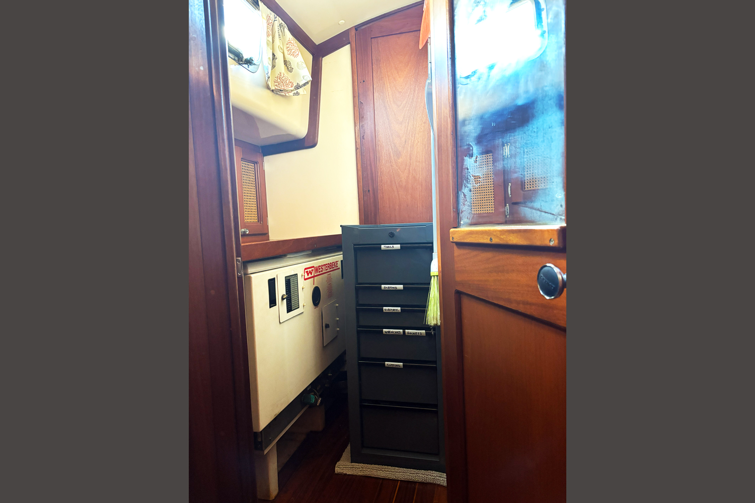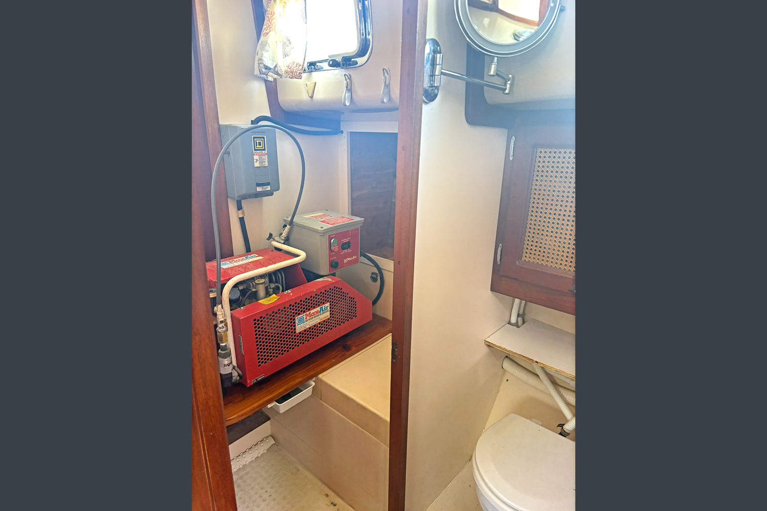 Dual heads are positioned opposite the galley and dinette with a separate stall shower between them, allowing flexible privacy arrangements for owners and guests. The aft head has been converted to a workroom with a generator, a large toolbox, and extensive storage for spares. The shower area holds the dive compressor.