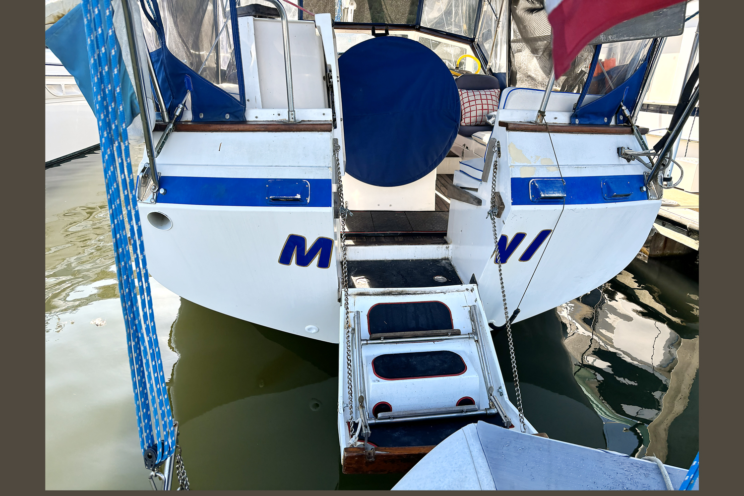 - Fold down the transom door to a platform with a stainless steel swim ladder